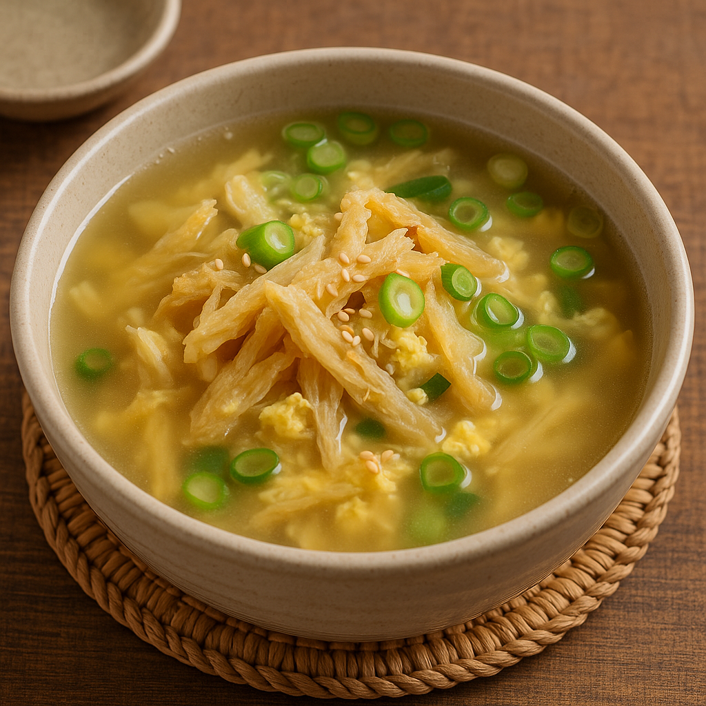 물 1.2L, 북어채 30g, 무 150g, 콩나물 120g, 대파 1대, 마늘 1쪽, 국간장 2작은술, 새우젓 1/3작은술, 후추 조금, 달걀 1개(선택).